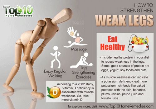 To strengthen weak leg muscles, you need a well-balanced diet, adequate fluids, a good exercise routine and proper rest.