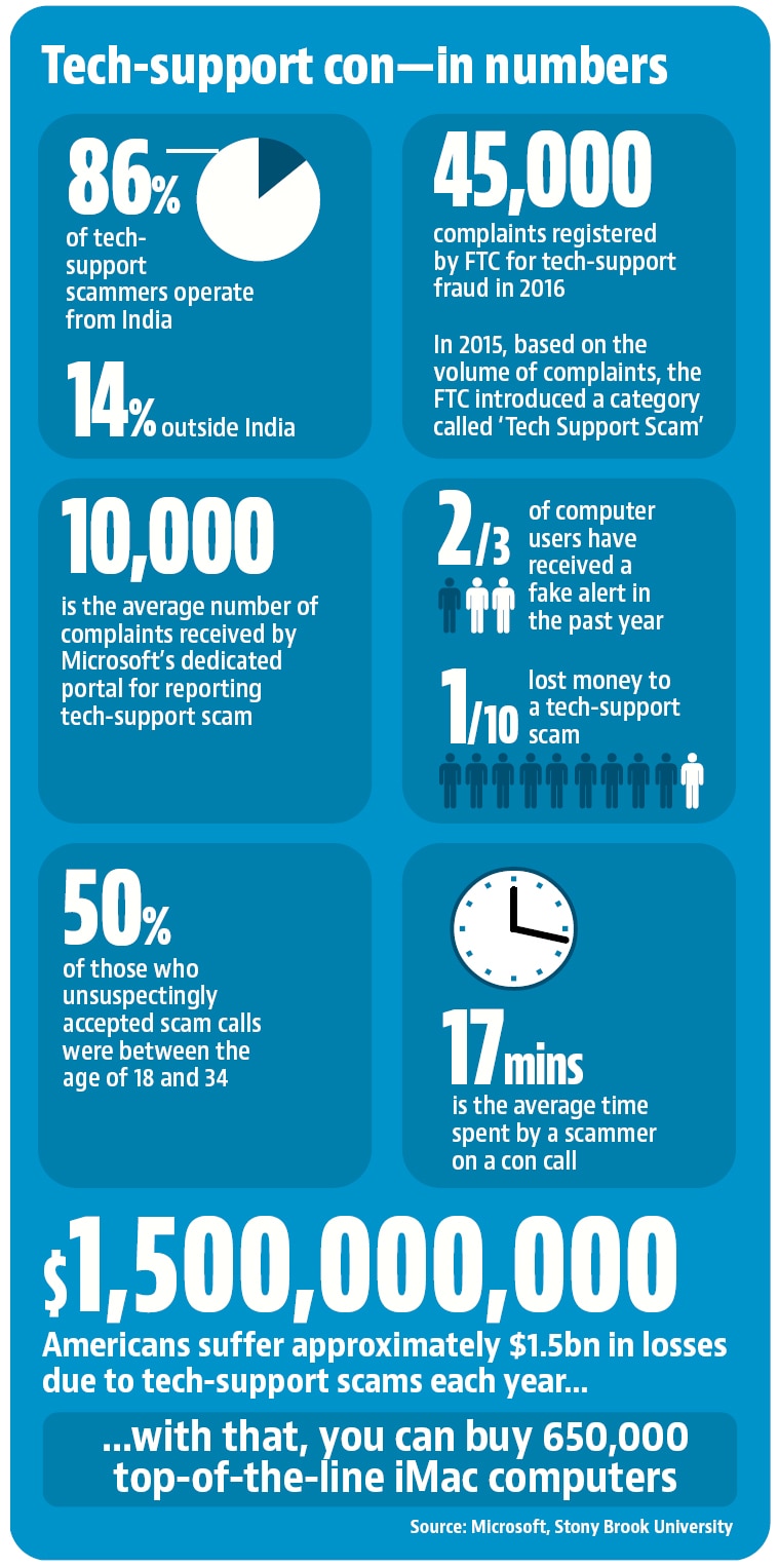 “Unfortunately, the scale of such scams originating from India is huge,” says Roy, also the founder of Quatrro, a big name in India’s BPO industry. “A small group of people with an internet connection and VoIP numbers can launch a tech support scam.”